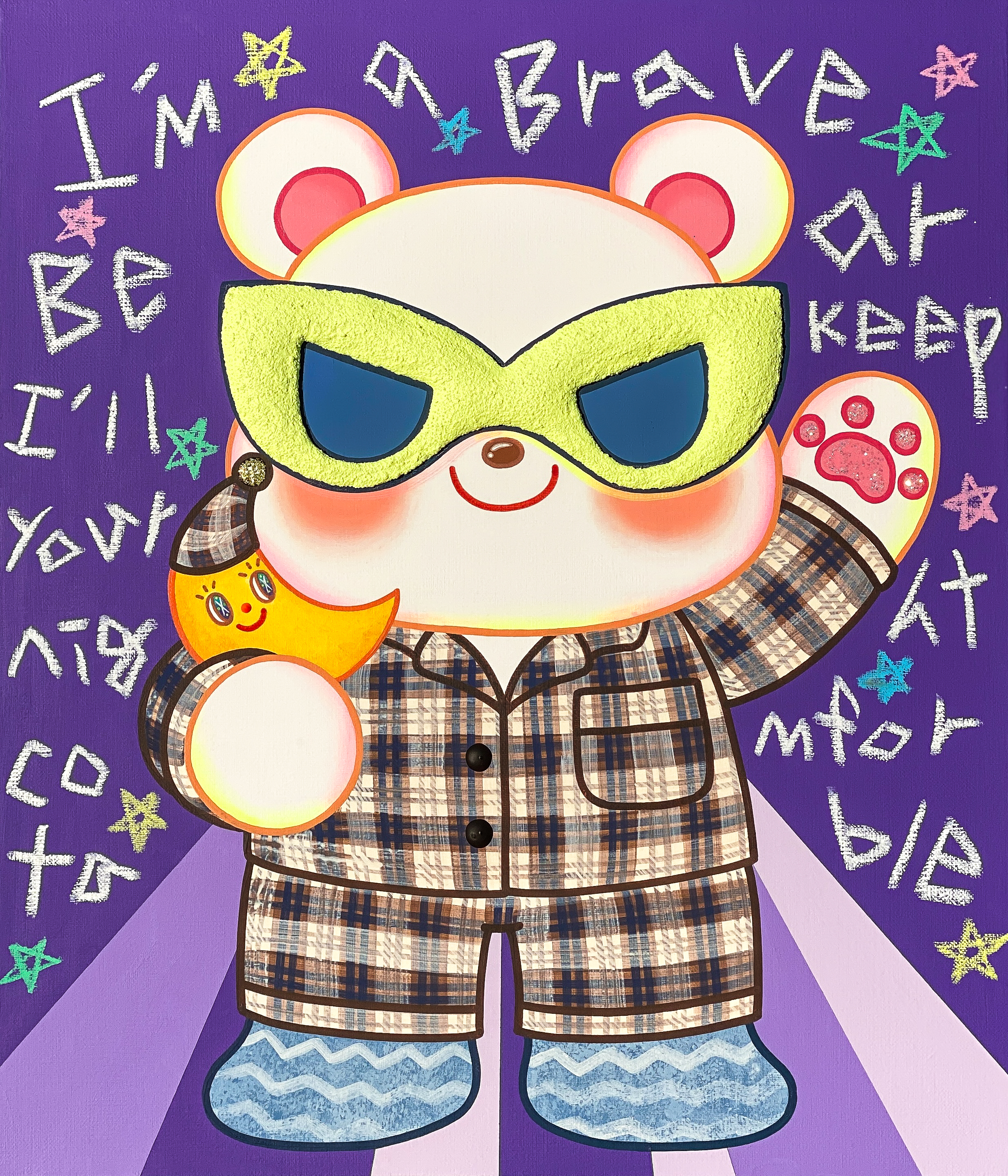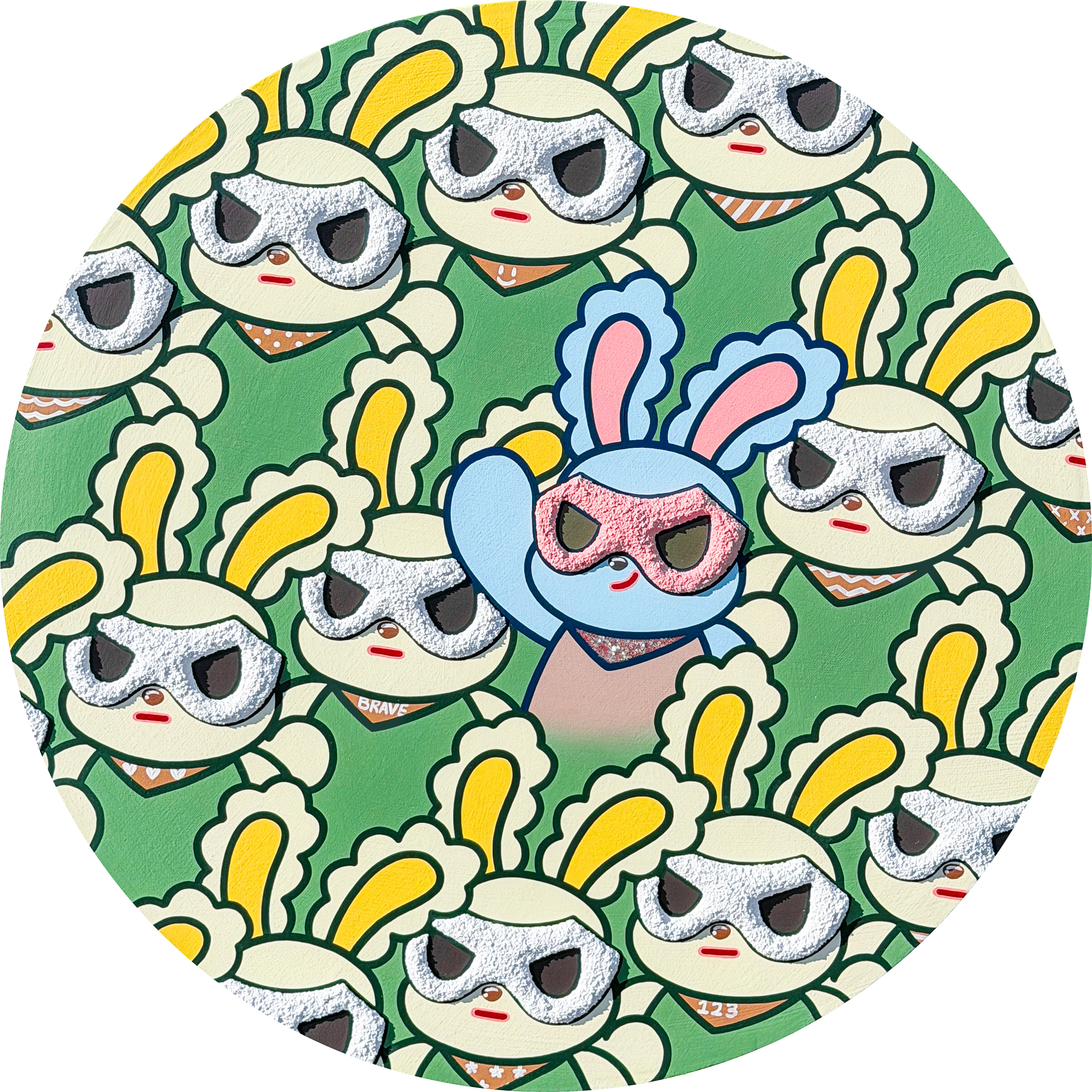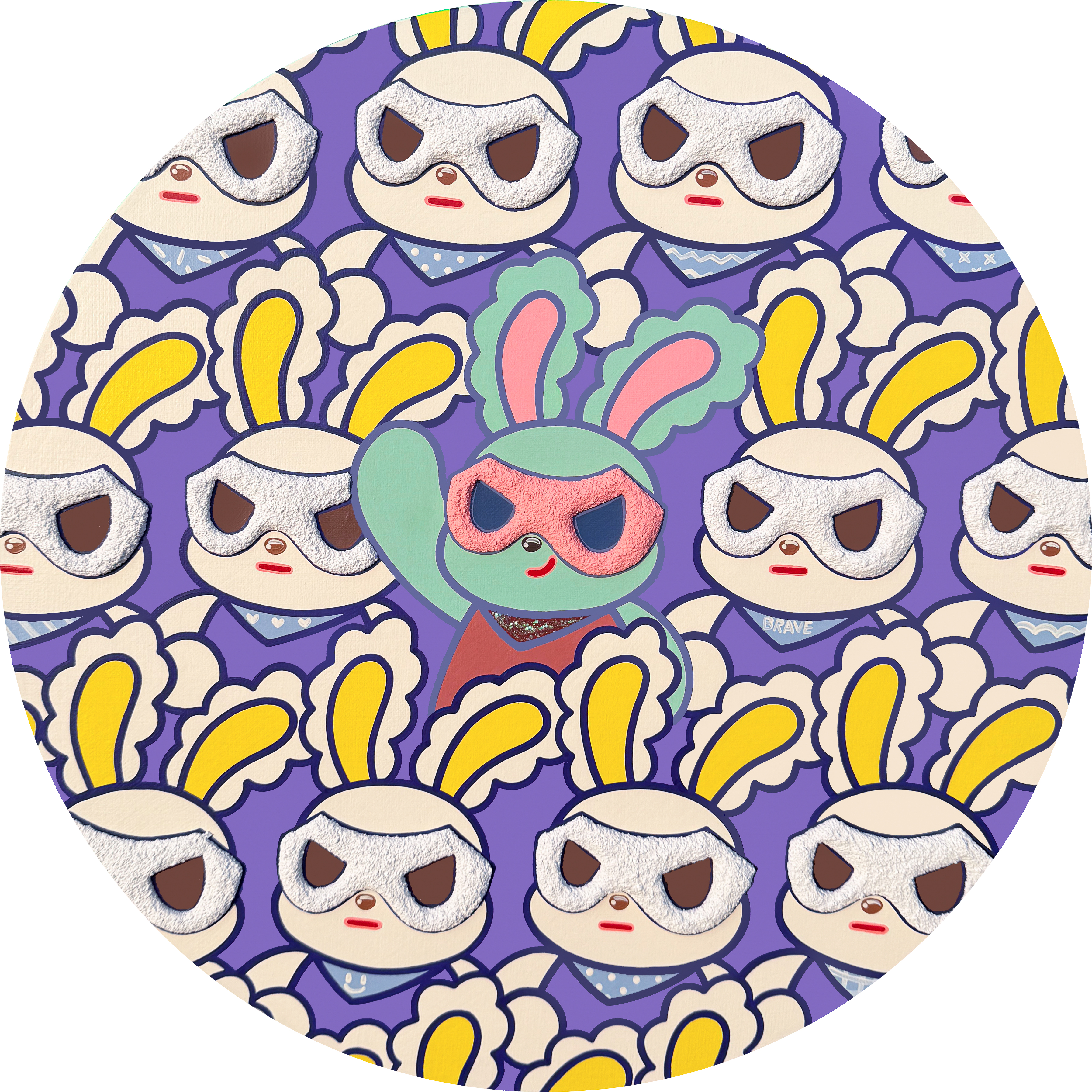 Park Seyeon explores selfhood, emotion, and growth through the motif of the mask. In her work, the mask is another self chosen to navigate reality, while also serving as a protective layer that safeguards the inner being. Confronting the mask becomes a process of understanding oneself. Through the act of wearing and removing it, the work suggests that regardless of outward appearance, an unchanging self remains beneath. The characters in her compositions are not fixed or complete; rather, they resemble ourselves in the midst of becoming. Emerging from memories and emotions rooted in childhood, they project the artist’s inner world and convey the courage to move forward—adorable yet assured—even while carrying wounds and anxieties within lived reality. The characters in the Mask and Animal series appear like heroes, declaring “I am brave,” and standing as presences that encourage one another.